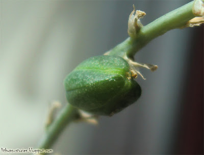 Thia is a ripening seed pod of a Haworthia limifolia featured here before. The 50 cm flower stalk and around 70 flowers weren't in vain after all! The other parent is probably Astroloba skinneri - since the plants are similar and have been flowering together since weeks - probably pollinated by some insect. I'm curious to see the seeds :)